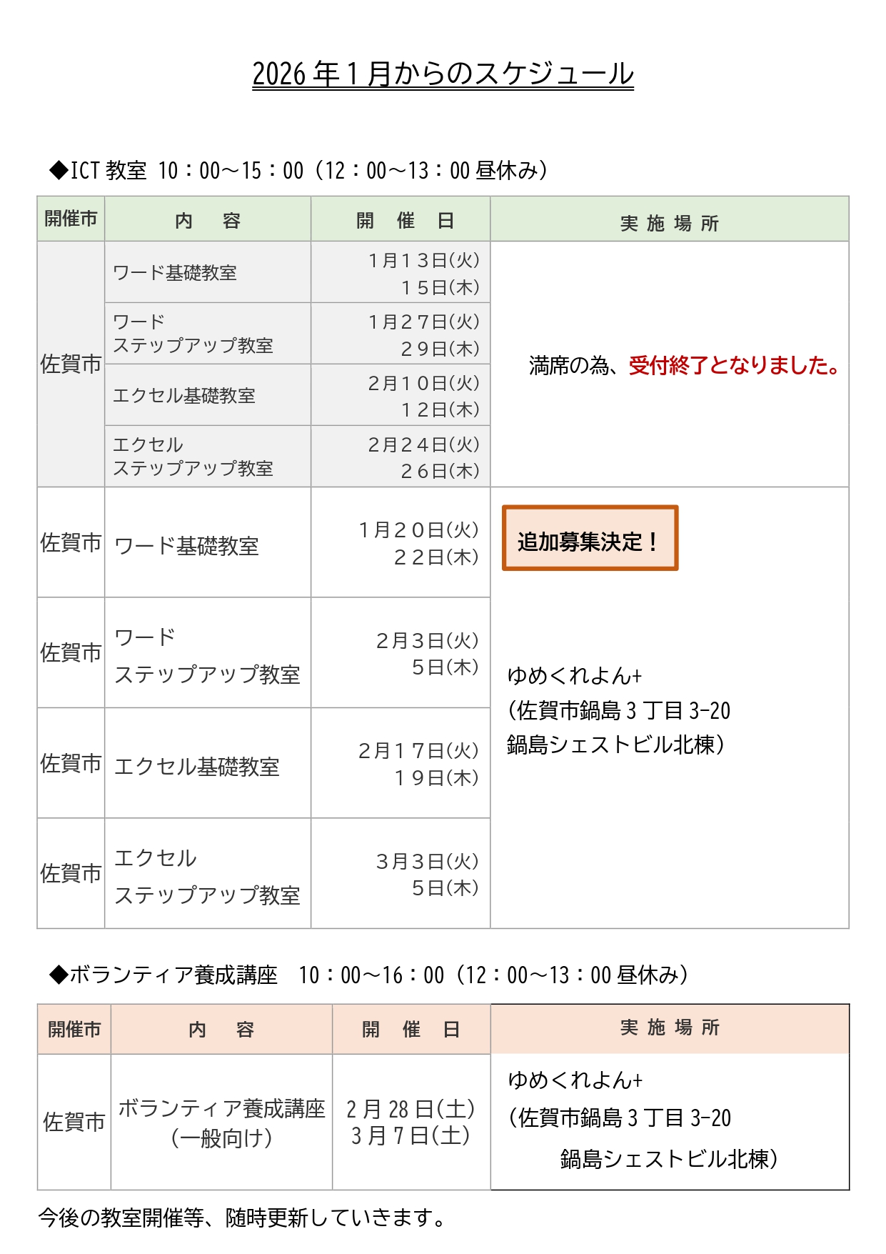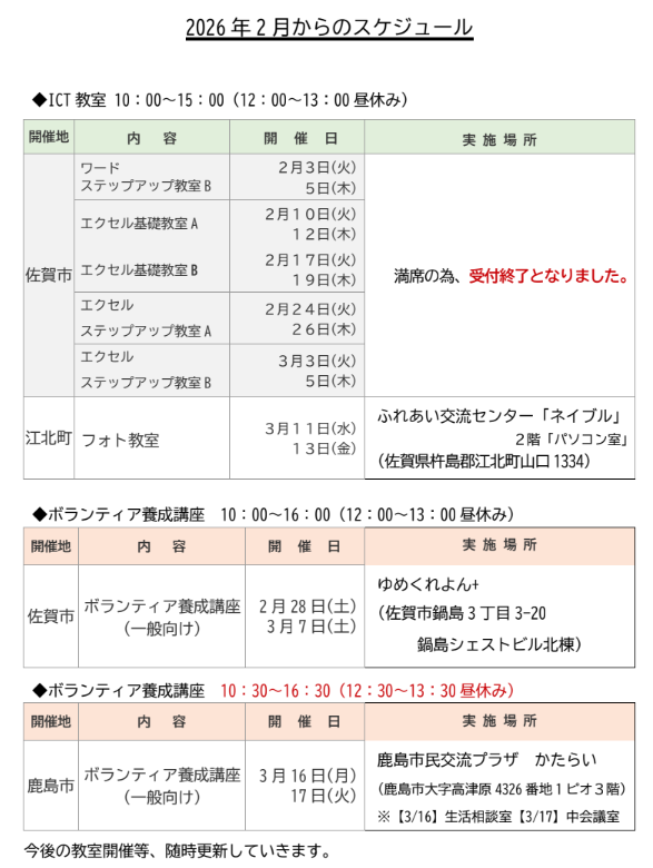 最新のお知らせ ICT教室のご案内2025年12月19日 ボランティア養成講座のご案内(佐賀市)2025年12月19日 ICT教室のご案内※満席の為、申込終了2025年11月28日 インターネット・iPad教室のお知らせ2025年9月10日 ボランティア養成講座開催のお知らせ(佐賀市)2025年7月10日